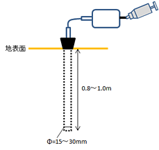 - 埋設管等確認のうえ、地表に直径15~30mm程度で深度0.8~1.0mの調査孔を作ります。